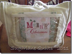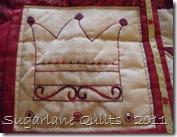 This fabric was simply perfect with all it’s glitter and gold….just like the gifts from the wise men! I did modify the pattern slightly and instead of ricrac, I used gold ribbon and embellished it with red ‘holly berries’ (ie beads!!!) Each stitchery worked in Cottage Garden Thread….